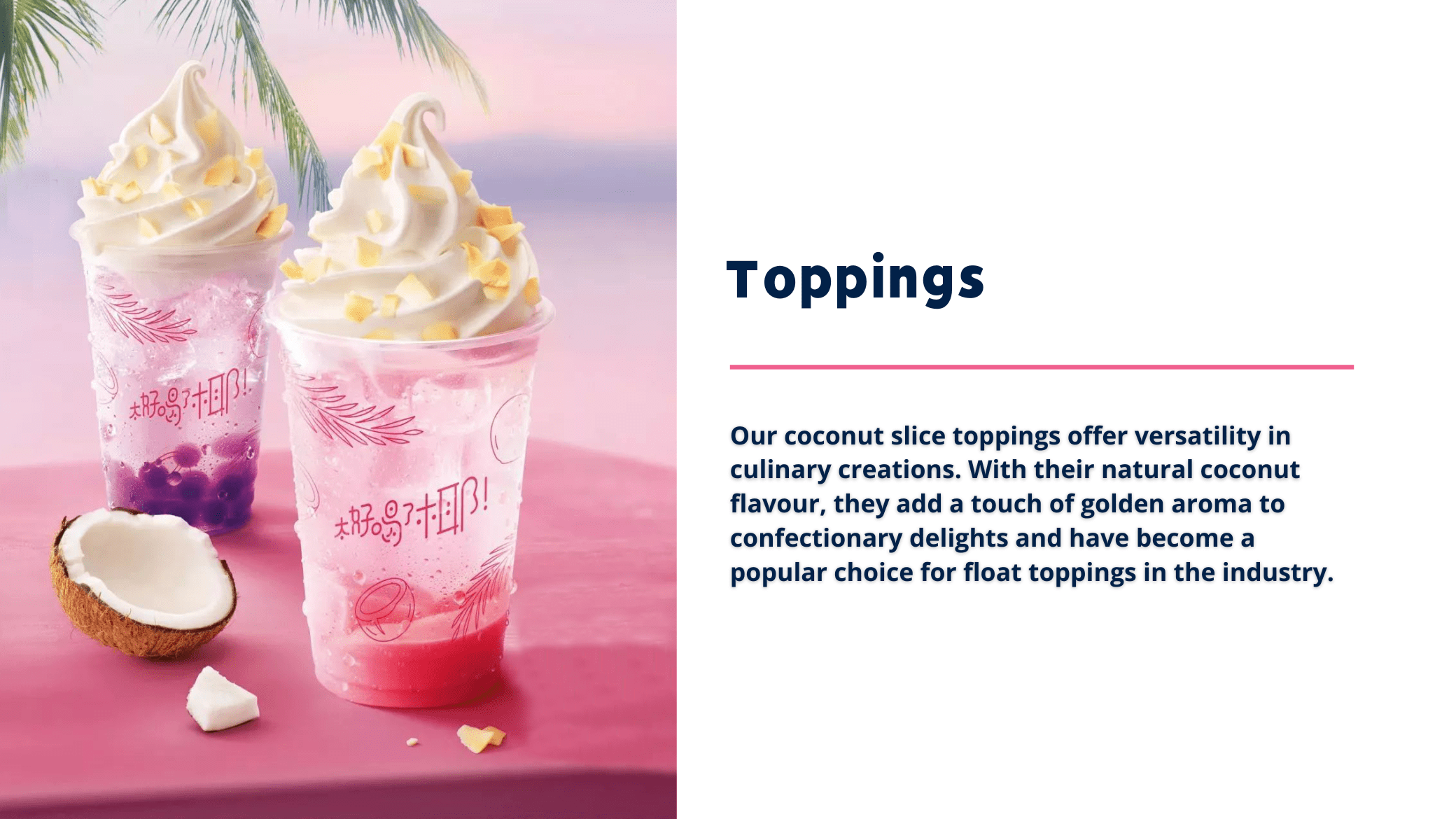 Our coconut slice toppings offer versatility in culinary creations. With their natural coconut flavour, they add a touch of golden aroma to confectionary delights and have become a popular choice for float toppings in the industry.