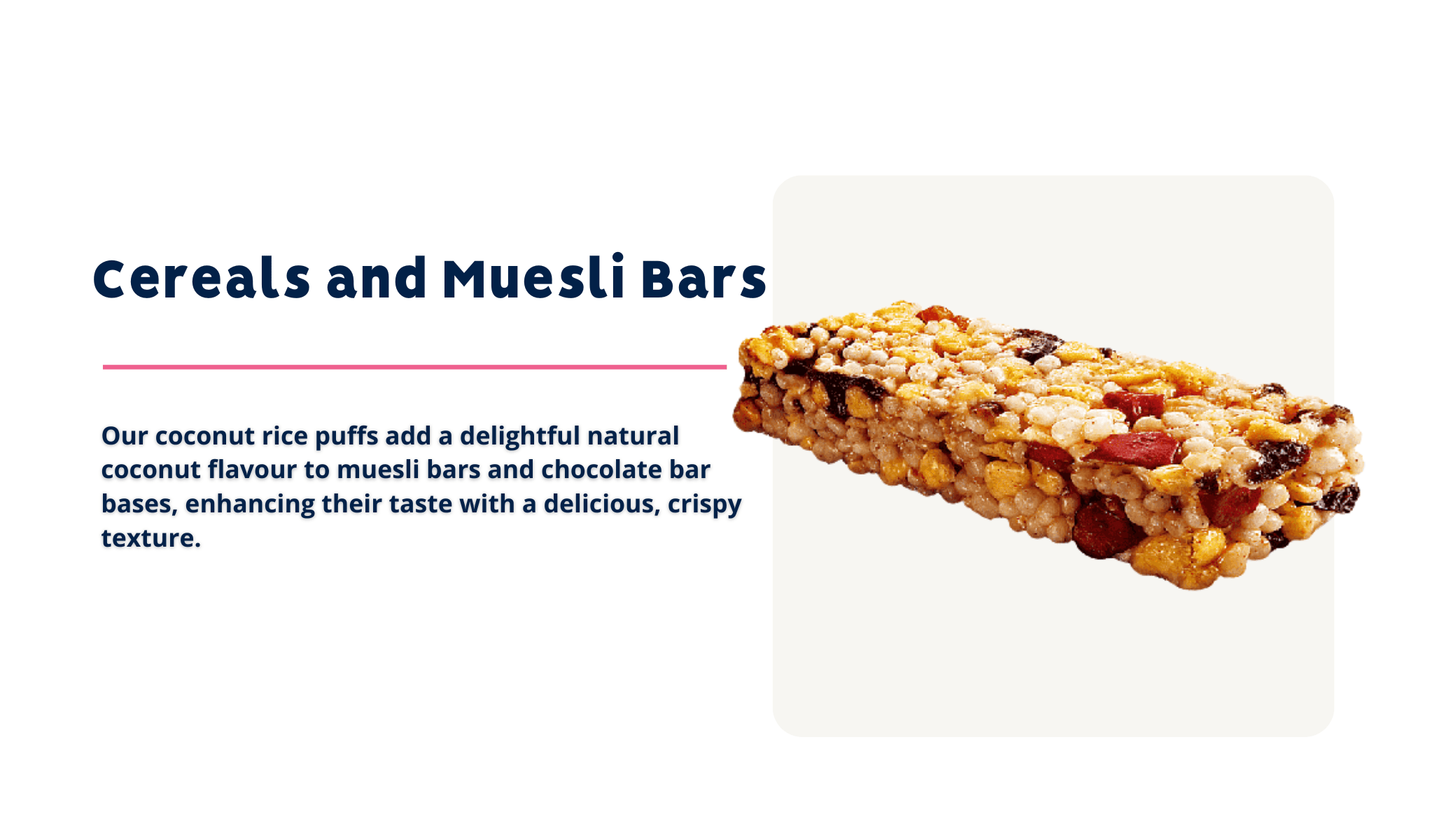 Our coconut rice puffs add a delightful natural coconut flavour to muesli bars and chocolate bar bases, enhancing their taste with a delicious, crispy texture.