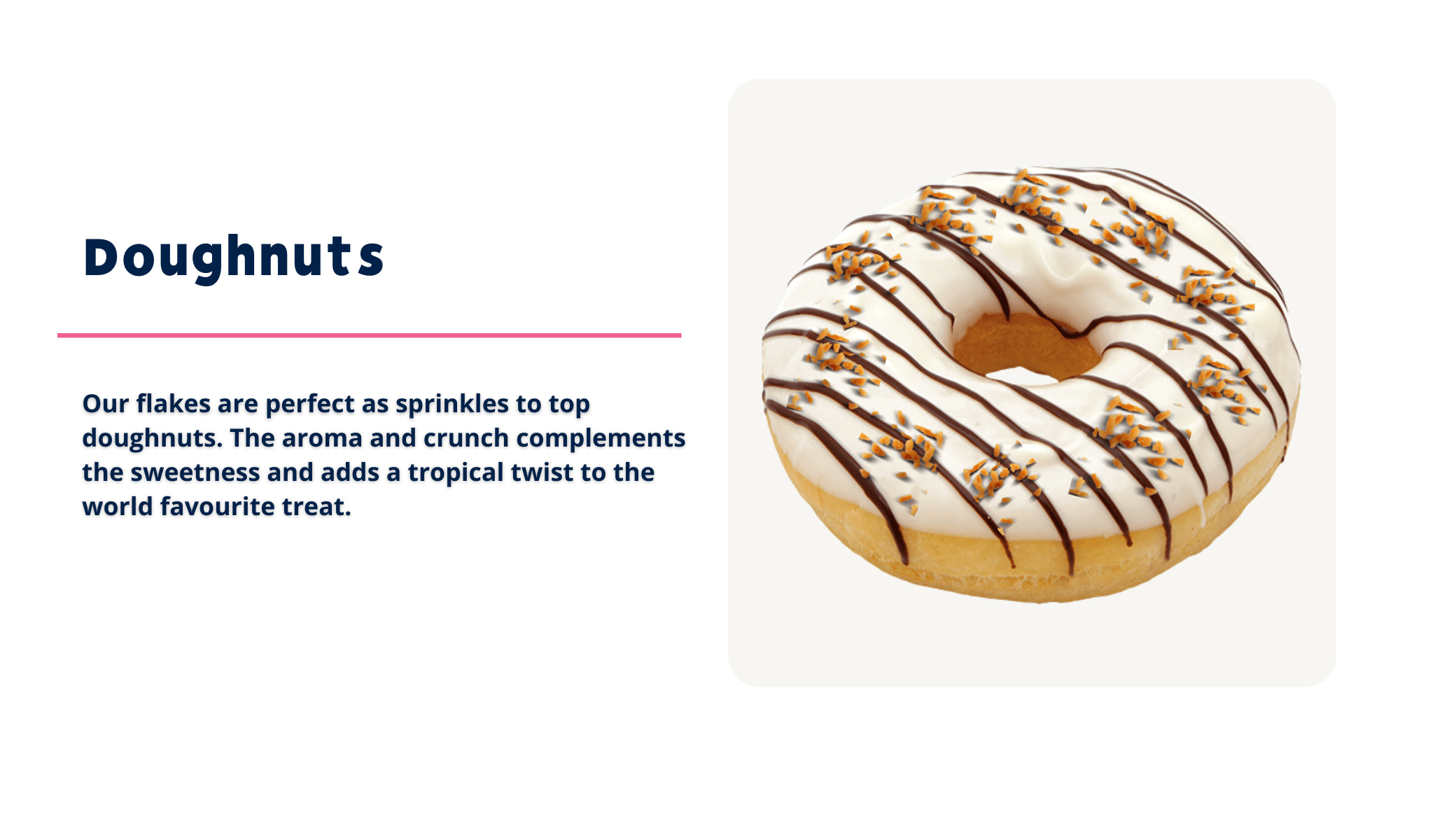 Our flakes are perfect as sprinkles to top doughnuts. The aroma and crunch complements the sweetness and adds a tropical twist to a world favourite treat.