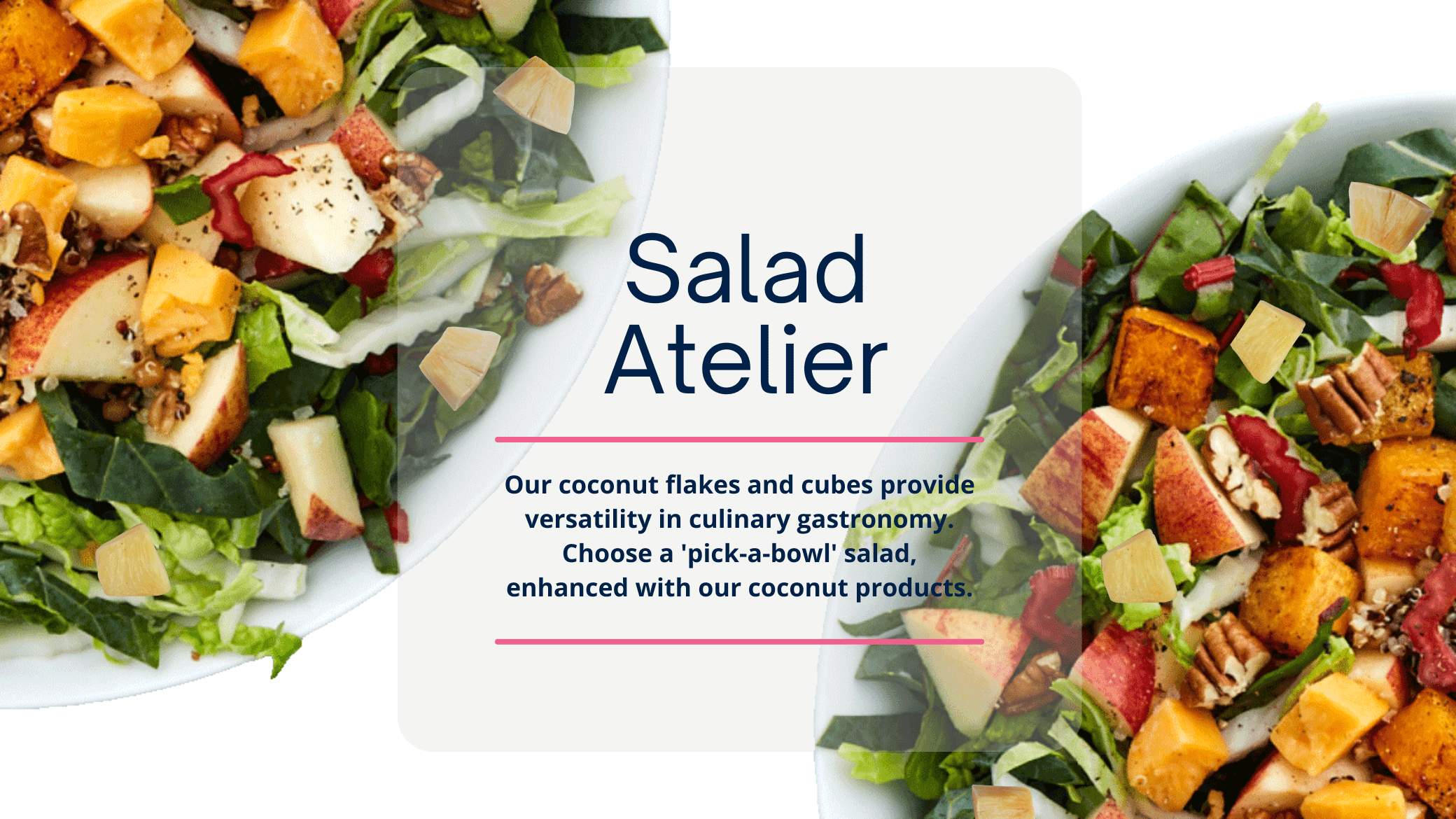Our coconut flakes and cubes provide versatility in culinary gastronomy. Choose a ‘pick-a-bowl’ salad, enhanced with our coconut products.