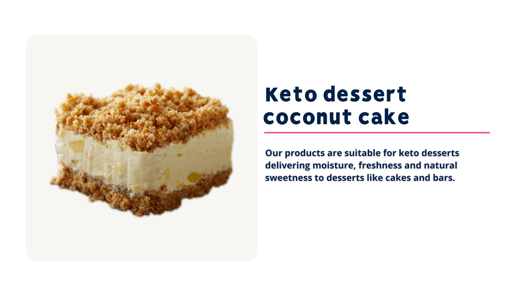 Our products are suitable for keto desserts delivering moisture, freshness and natural sweetness to desserts like cakes and bars.