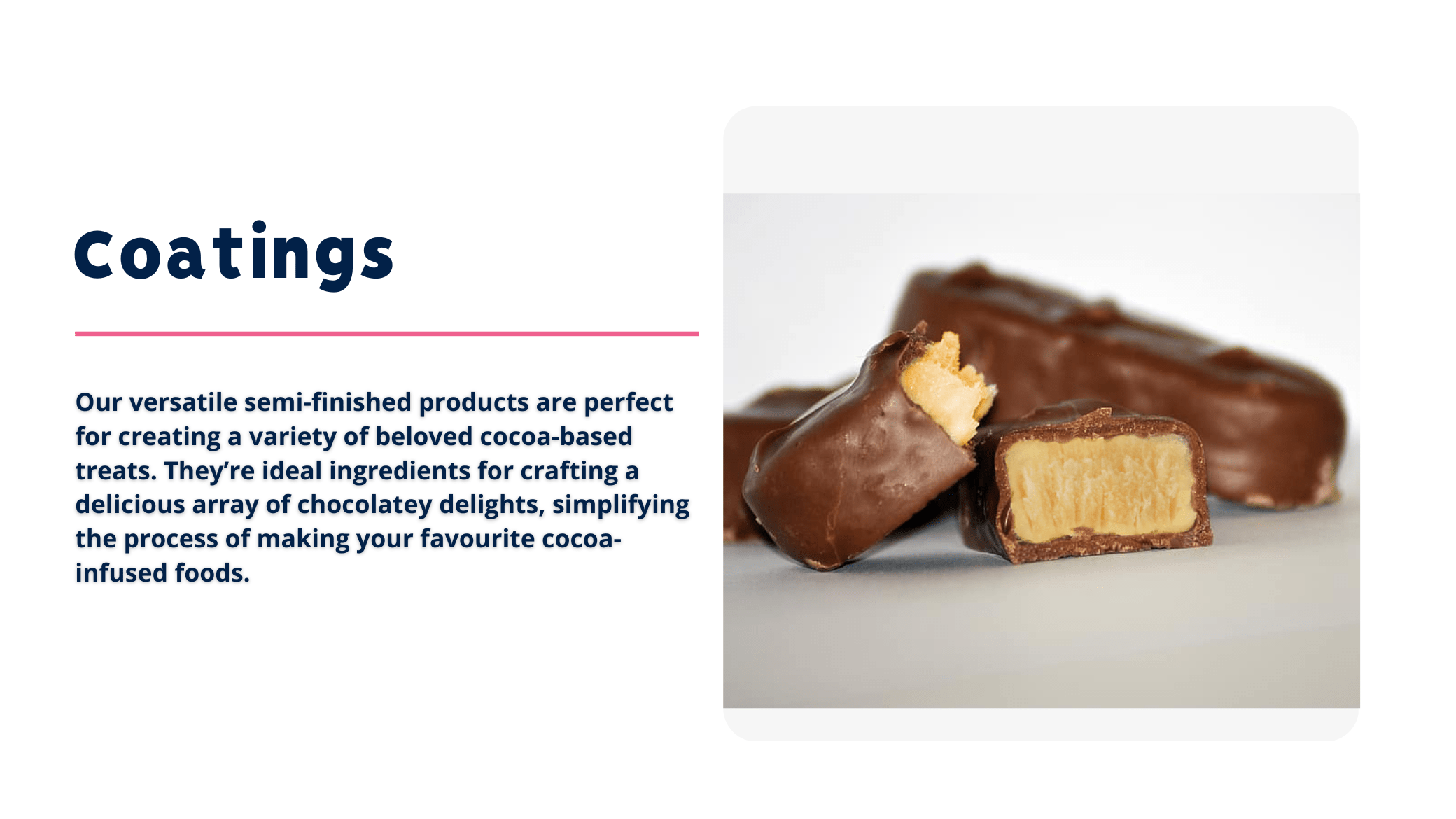 Our versatile semi-finished products are perfect for creating a variety of beloved cocoa-based treats. They’re ideal ingredients for crafting a delicious array of chocolatey delights, simplifying the process of making your favourite cocoa-infused foods.
