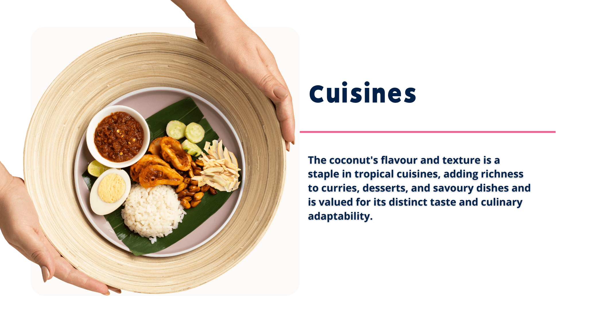 The coconut’s flavour and texture is a staple in tropical cuisines, adding richness to curries, desserts, and savoury dishes and is valued for its distinct taste and culinary adaptability.