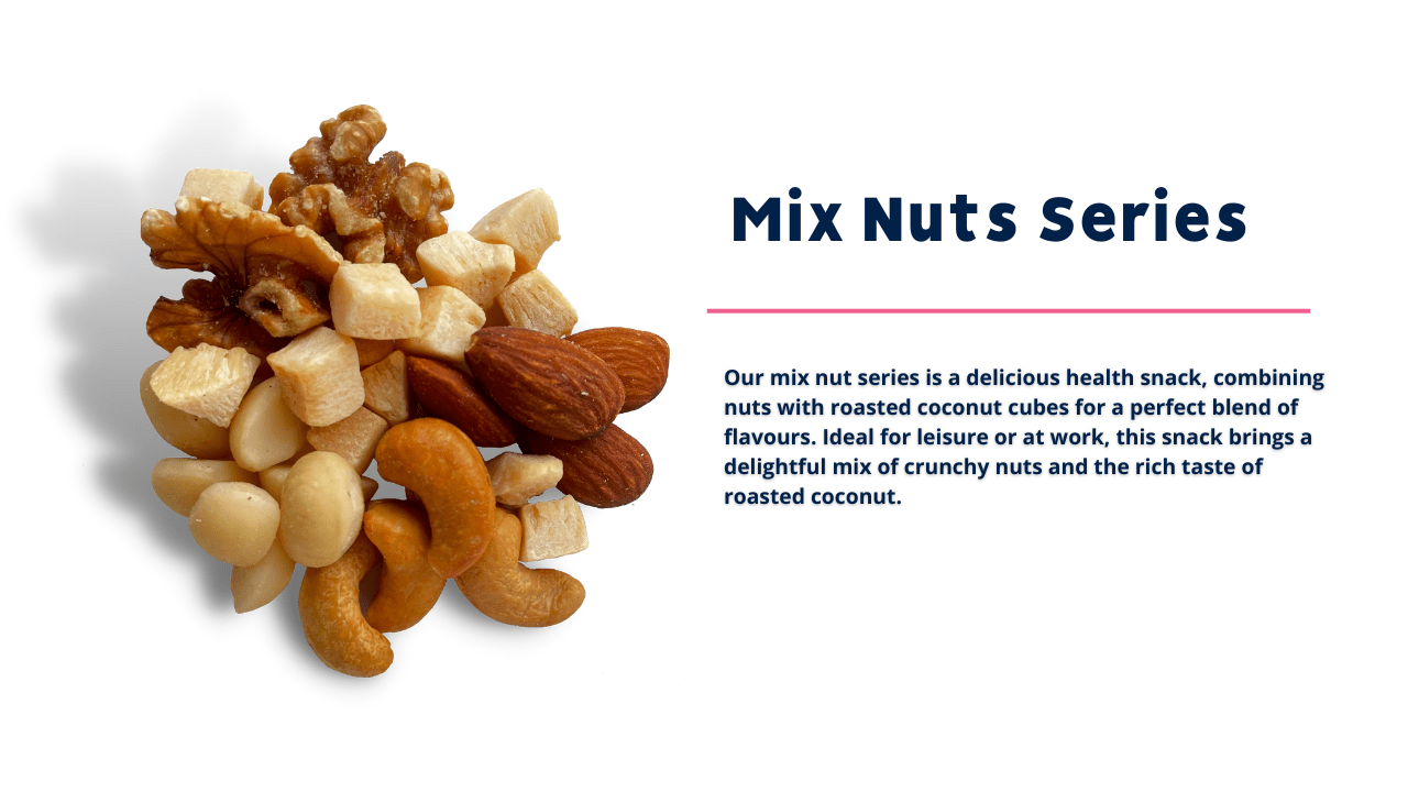 Our mix nut series is a delicious health snack, combining nuts with roasted coconut cubes for a perfect blend of flavours. Ideal for leisure or at work, this snack brings a delightful mix of crunchy nuts and the rich taste of roasted coconut.